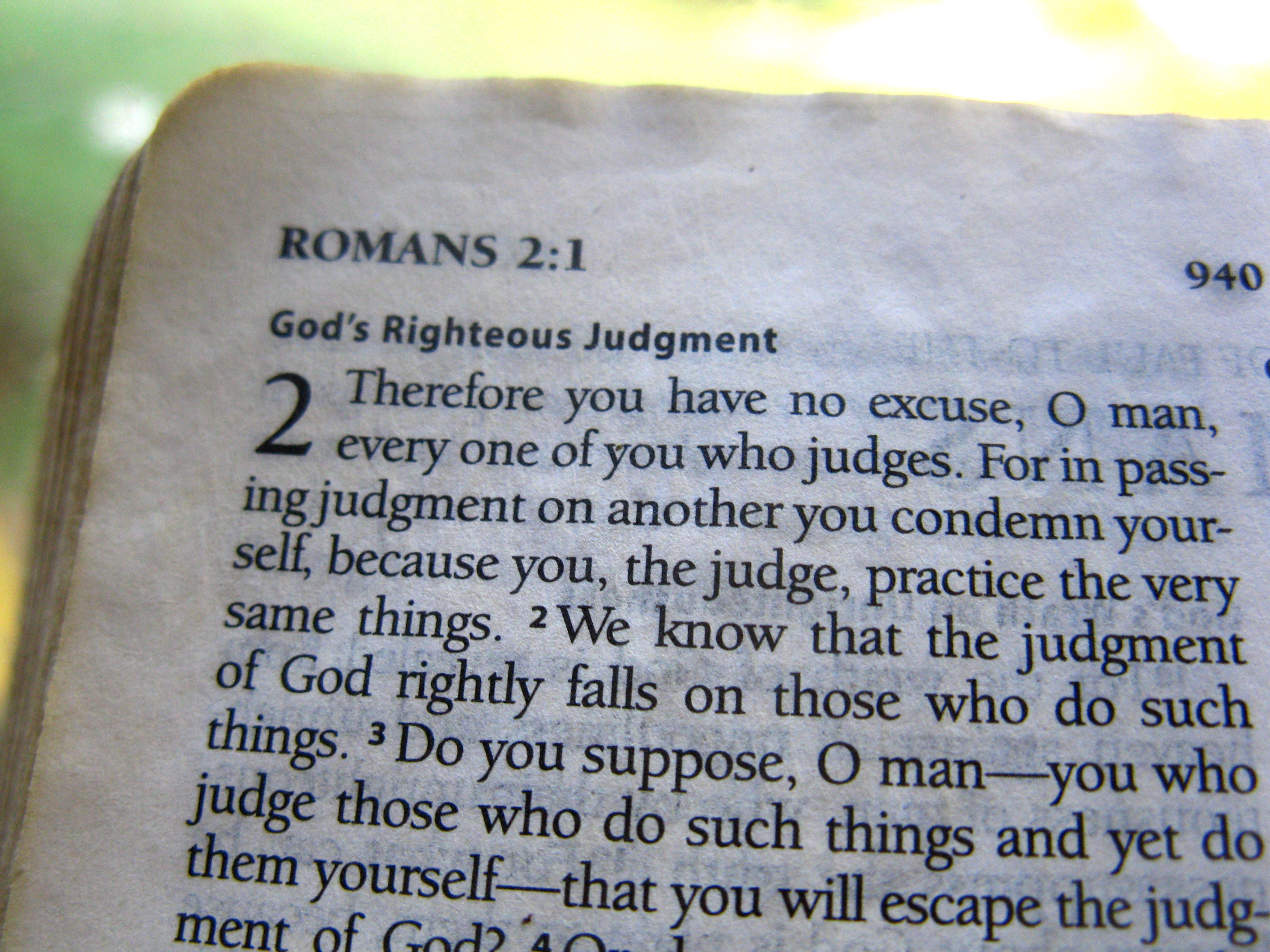 During my senior trip to New York City, a teacher shared an evening devotional from Romans 1-3. When he read Romans 2:1, I felt as if God was speaking directly to me, “Therefore you have no excuse, O man, every one of you who judges. For in passing judgment on another you condemn yourself, because you, the judge, practice the very same things.” This verse spoke directly into my experience as one who so often judge others with confidence in my own righteousness. I sat staring at these words until the page blurred away through tears of conviction. “How could I have been so blind?” I thought. My self-righteousness and pride must be so hideous to God.